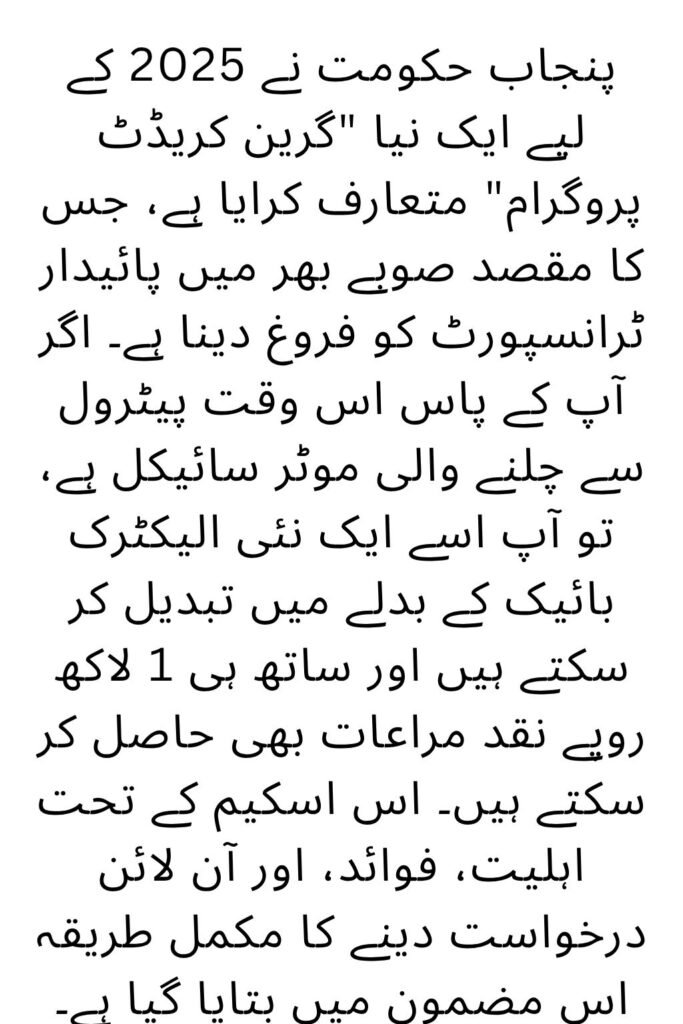 The Government of Punjab has unveiled an exciting new initiative Green Credit Program aimed at promoting sustainable transport across the province. If you currently own a petrol-powered motorcycle, you can now trade it in for a brand-new electric bike, plus receive a cash incentive of 100,000. This article provides detailed guidance on eligibility, benefits, and how to apply online to take advantage of this generous scheme.